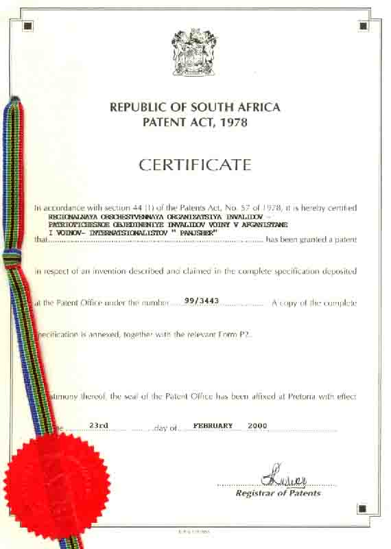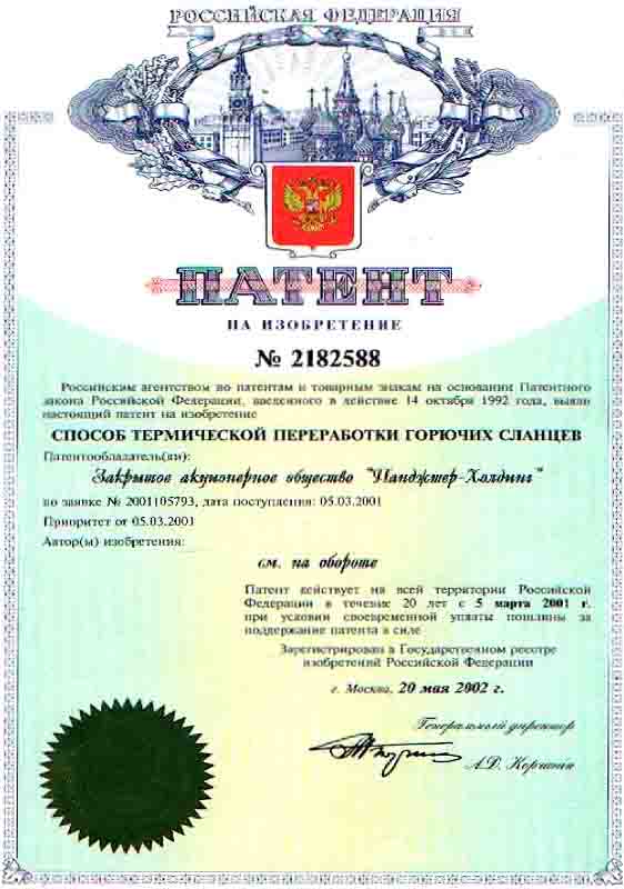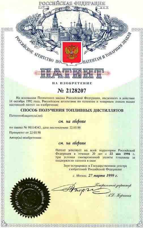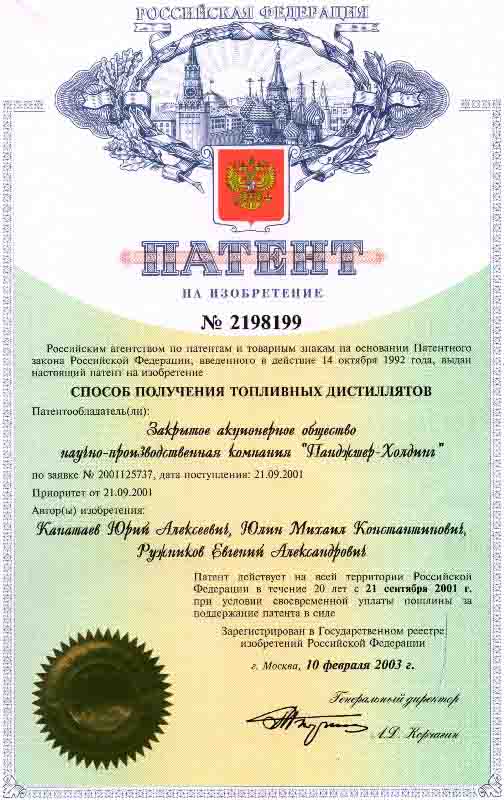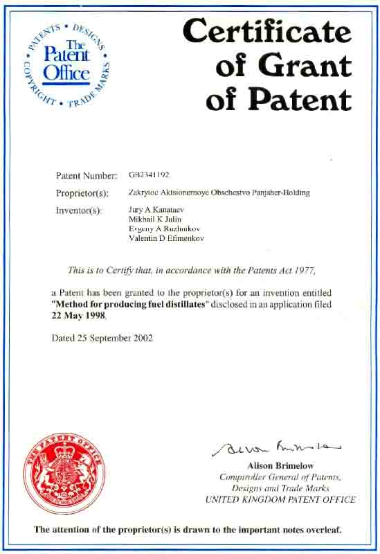 • Компания имеет права на изобретения объектов промышленной собственности, которые защищены Патентами РФ 1994-2007 г.г., а также Патентами ЮАР, США, Великобритании, Китая и Индии 1999-2008гг. Также могут быть представлены следующие изобретения - РФ: № 2009162, 1994г.; № 2009166, 1994г.; № 2128207, 1999г.; № 2182588, 2002г.; № 2198199, 2003г.; № 2261265, 2005г.; № 2297439, 2007г.; США: № US 6,190,537 B1, 2001г.; Великобритании: № GB2341192, 2002г. и № GB2393731, 2005г.; ЮАР: № 99/3443, 1999г. и № 2004/1109, 2005г.; Китая: № 108819, 2003г. и № ZL 01823628.6, 2006г.; Белоруссии: №10367, 2007г.; Индии: № 217998, 2008г.